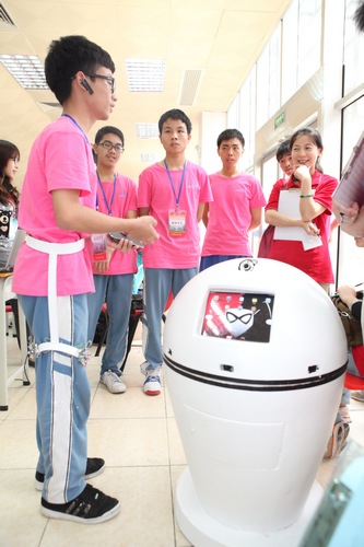 参加创意比赛的同学在介绍自己的作品--机器人社区志愿服务者
