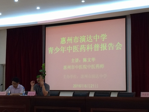 6月21日上午,惠州市惠城区青少年科学教育特色学校演达中学举办了以“弘扬中医药文化,建设健康和谐校园”为主题的中医药科普报告会,惠州市中医院中药师陈文华应邀为现场200多师生作了“青少年中医药科普”专题报告。惠城区科协副主任科员李彦青、田勇参加了报告会。报告会上,李彦青勉励与会同学通过种植中草药,直观了解中草药,更好地学习中医药,为将来振兴中医药事业奠定良好基础。