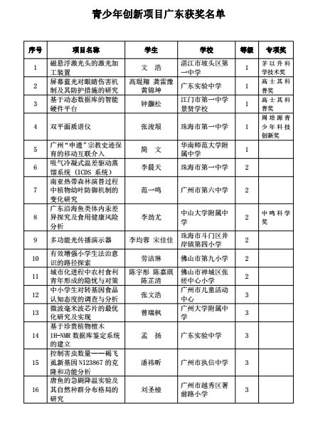 经省赛选拔推荐,我省师生参加全国大赛4大项目角逐,使出洪荒之力,喜获佳绩,总体成绩继续保持全国领先。在含金量最高的青少年创新项目中,南粤学子荣获一等奖5项(全国56项)、二等奖6项、三等奖5项,专项奖5项,一等奖数位列北京、上海之后。在科技辅导员创新项目上,我省荣获一等奖1项(全国32项),二等奖2项,三等奖5项,专项奖3项。