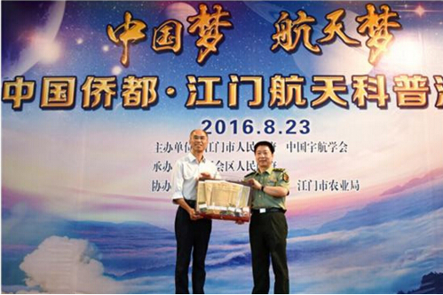 在启动仪式上,航天英雄杨利伟把从太空归来的包括牛大力、新会小农占、新美夏珍、恩平辣木、蓝海辣木、恩平菜心、朝天辣椒等多个品种的种子及公证书移交给市长邓伟根,让“飞天”侨乡种子回到它的家乡。同时为新会梁启超中学“全国航天特色学校”揭牌。随后,航天员刘洋为梁启超纪念中学1000多名师生们作航天科普专题讲座。这个机会,是梁思礼院士生前积极“牵线搭桥”促成的,是侨乡航天育种迈出的重要一步,更是江门市现代农业发展、农业强市建设的重要里程。