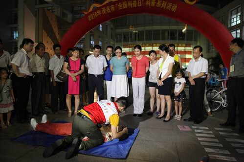 2016年茂名市“全国科普日”系列活动正式启动,茂名市有关领导在观看心肺复苏