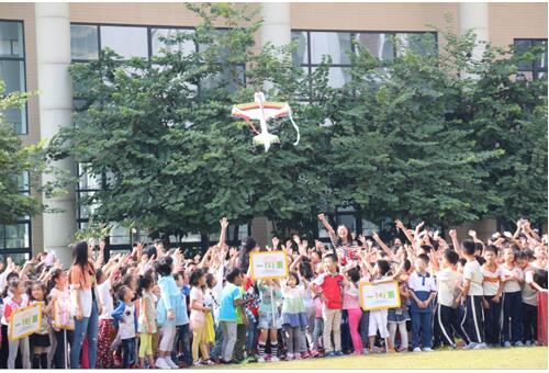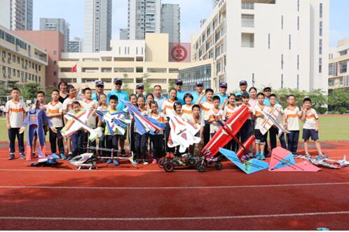 科普大篷车进校园最吸引人的莫过于广东省翱翔科技模型表演队的精彩表演。随着美妙《梁祝》响起,两架花式模型飞机一会儿悠然上空,一会儿垂吊半空缓缓旋转,如同两只轻盈的蝴蝶翩翩起舞;歼10战机携雷霆之势呼啸冲向蓝天盘旋翱翔,犹如一只身手矫健的雄鹰;航模直升机表演横滚、侧飞、倒飞等高难度动作,轻松自如得如一只轻盈的蜻蜓;雄纠纠气昂昂的大型超人模型滑翔机,在两架歼10护航下,时而高飞望远,时而列阵,时而低空巡视,像随时与罪恶斗争,保护人类。其他如线操纵古董飞机、七彩纸模型飞机、手掷模型滑翔机,航拍的四旋翼直升机等,12架大小不一,类型各异的模型飞机,依次在空中展开竞技表演。曾经拿过世界、国家大赛奖项的教练员们以高超的操纵技术征服了师生们,赢得师生们无数的喝彩。每场表演结束,教练员及飞机模型都会被同学们围得密密的,孩子们问这问那,对航模爱不释手,想必心里早已升腾起飞上蓝天的梦想。