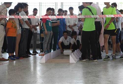 高中组“奔跑吧,环保车”(塑料瓶车障碍赛)现场
