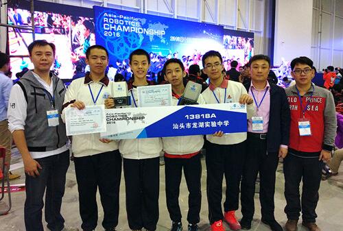 汕头市青少年科技特色教育又取得历史性突破!近日,来自龙湖实验中学的吴大卫等4名学生在领队和指导老师的带领下,经过激烈角逐,在2000多名参赛者中斩获第十届亚洲机器人锦标赛中最高级奖项VEXIQ项目“全能奖”等多个奖项(右图),赢得了明年4月将在美国举行的“VEX机器人世界锦标赛”参赛资格!