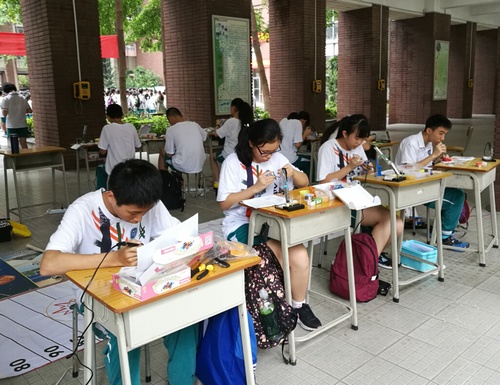 5月17日的广东实验中学附属天河学校饶宗颐图书馆广场披红挂绿,布置一新:门楣上“青少年科学调查体验活动启动仪式”会标分外醒目,两边是巨幅楹联“享受成长岁月,体验创新乐趣”,对面第二连廊的巨柱上,悬挂着巨幅标语“培育创新人才,倡导创客教育”。