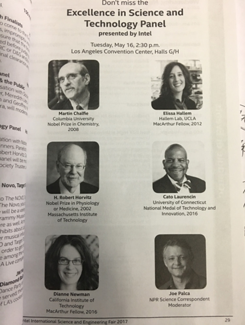 第一件事是“大伽”不“伽”。每年大赛都会邀请几个诺贝尔奖获得者和国际上崭露头角的青年科学家参加杰出科学家交流会,与青少年面对面交流对话。今年有2个诺贝尔奖获得者、3个天才奖获得者和1个美国国家技术与创新奖获得者参加,但开幕式上主持人介绍这些响当当的科学大伽时,他们无一例外都是在学生选手后面的观众席上站起向大家致意。主办方认为大赛的主角是Finalist(选手),Finalist之外的任何人应当成为配角。“或者这样的认知也许在一定程度上解释了这个大赛本身的价值”。