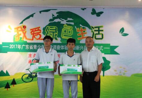 新兴县科协曾荣光主席为学生颁发“我爱绿色生活”活动资源器材,新兴县万事泰不锈钢制品有限公司向学校“真.活”创客中心捐赠了3D打印机、无人机、魔方复原机器人、遥控KT板战斗机等一批科技活动器材。