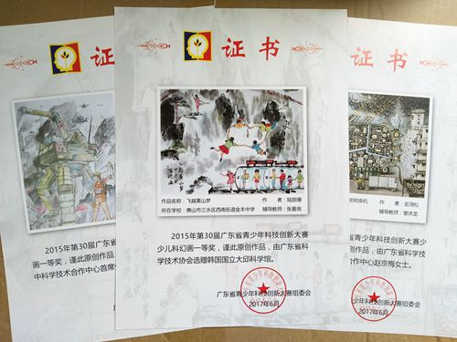 这些纪念品就是第30、31届广东省青少年科技创新大赛科幻画一等奖获奖作品,包括广州市番禺区市桥东风中学邬志韬同学的《抢救掘进机》(辅导老师:陈焕仪);佛山市三水区西南街道金本中学陆丽珊的《飞越黄山梦》(辅导老师:刘付仲军)和东莞市光明中学史鸿松的《自由升降旋转式全智能转换机》(辅导老师:曾庆龙)。这3幅科幻原画经装裱后美轮美奂,省科协选作对外交流赠送国外单位和友人的纪念品。