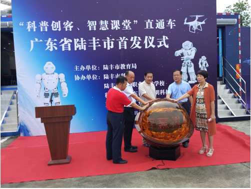 7月4日, 由汕尾市陆丰市科协、教育局牵头组织,联合科大讯飞广东讯飞启明科技发展有限公司直通教育(广州)有限公司,在陆丰市第二职业技术学校举办“科普创客、智慧课堂”直通车进校园活动首发仪式。