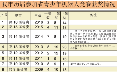 广东是青少年机器人活动的发源地之一,2001年和2002 年的第一、二届全国赛均在广东省举办,每年参加该项赛事的广东学生总成绩一直稳居全国三甲,甚至曾连续10年在全国赛中夺得金牌数第一。今年7月的第17届全国赛,主赛场设在中山市实验中学,分赛场设在中山职业技术学院。