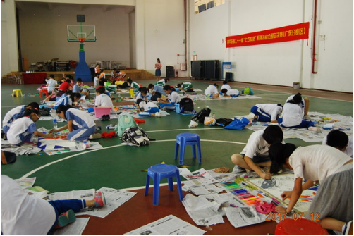 11日中午,在市科协科普部部长的带领下,阳江代表队从阳江出发,一路欢歌笑语来到广州。当天晚上,老师学生们不顾路途的疲惫,马上投入到赛前准备当中,把酒店走廊当教室,把地板当桌面,学生三五成群地趴在地板上作画,老师在一旁指导,家长在一旁鼓劲。整个过程中,每个同学都保持着最佳的精神状态来领悟老师讲解的每一个细节,老师的每一句话语都给同学们注入了信心和希望。