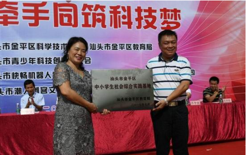 活动首先由金平区教育局党委书记蔡少文致辞,接着科协主席刘礼深讲话。蔡少文书记向遇见赛先生汕头市科技体验馆授予“金平区中小学生社会综合实践基地”的牌匾。授牌仪式后,东西部学校“手牵手同筑科技梦”科学素质教育结对交流体验活动依序进行。