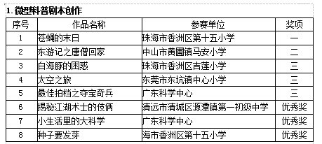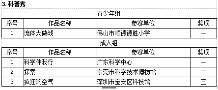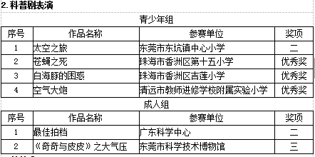 本届大赛包括原创微型科普剧本创作、科普剧和科学秀表演等3大部分。经过激烈角逐,珠海市香洲区第十五小学《苍蝇的末日》在科普剧本创作项目上获得一等奖(全国共10项),科学秀青少年组仅设一个一等奖,由佛山市顺德区德胜小学《流体大做战》摘冠。我省其他参赛项目均取得喜人成绩,充分体现南粤青少年的实力和水平。