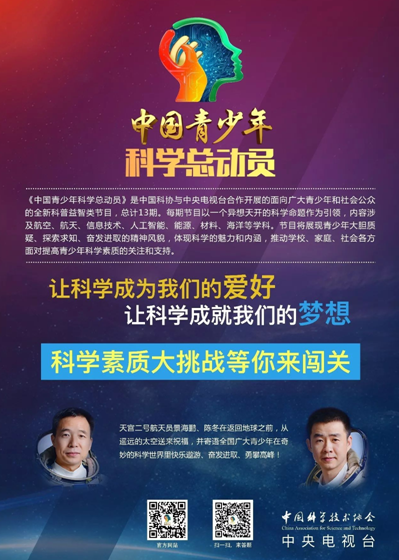 中国科协和中央电视台共同录制的《中国青少年科学总动员》经过紧张的后期制作,从10月15日开始,每晚20:00在中央电视台十套(科教频道)播出,敬请关注! 我省参赛选手:广州市天河区外国语学校范原浩 活动宣传海报 《中国青少年科学总动员》是一档面向广大青少年和社会公众的全新科普益智类节目,总计13期。每期节目以一个异想天开的科学命题作为引领,内容涉及航空、航天、信息技术、人工智能、能源、材料、海洋等学科。