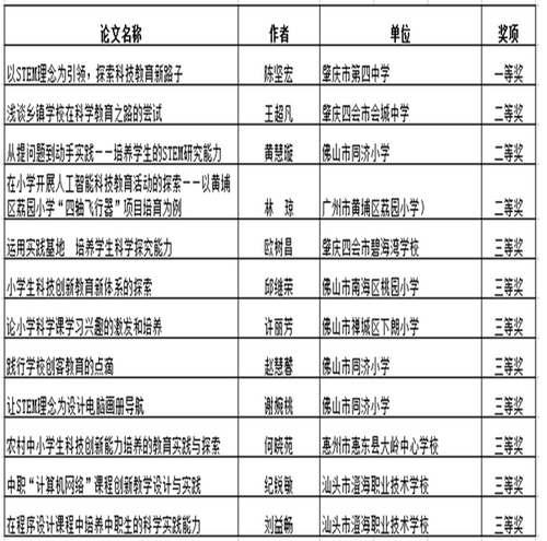 省青少年科技教育协会推荐了17篇论文参加全国征评活动,其中肇庆市第四中学陈坚宏老师的《以STEM理念为引领 探索科技教育新路子》获得一等奖,3篇获二等奖,7篇获三等奖,总体成绩优秀。