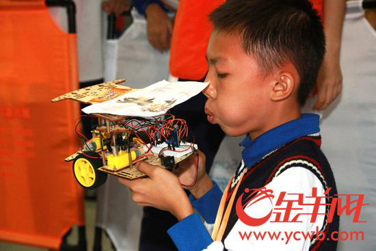 金羊网讯 记者叶志垚报道:2个普通的小马达,几个简单电子元件和几根电线,再添加些常见的环保材料,就可以制作出一个造型酷炫、活灵活现的智能机器人。它不仅能行走、识别和装卸货物、甚至能将货物运输到指定的地方,而如此高科技的仓储机器人竟然是一批中小学生在大赛上制作的。