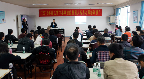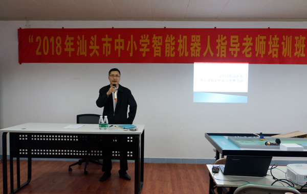 3月24日下午,汕头市科协和汕头市教育局联合主办的“汕头市2018年机器人竞赛教练员培训班”在汕头科技馆举行,来自我市中小学校的近80名教师参加了培训。市教育局电教仪器站陈少斌站长出席开班仪式并讲话。