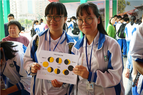 “教你一分钟认识日食”,在27日的广场活动中,省天文学会常务理事罗坚强老师和广州市少年宫龚靖贻老师,用日食演示仪直观展示日食演变全过程,广州市黄埔区荔园小学的林琼老师则指导大家用“泥巴”,绘制出一个完整的月相变化图,引来大批群众和青少年的围观参与。