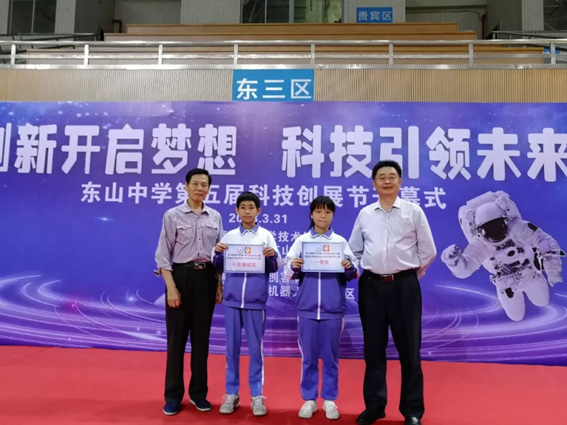 本次活动,还介绍了东山中学近期参加各级各类科技创造比赛的情况,表彰了2017年组织学生参加“梅州市第33届青少年科技创新大赛暨梅州市第3届中小学创客创作大赛”的获奖师生,并由领导嘉宾为获奖师生代表颁奖。