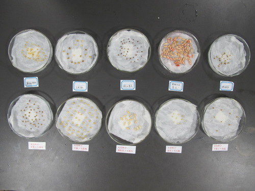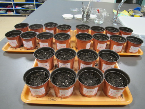 种植前期,我们首先购买了优质的营养土和肥沃田园土按照3:2的比例进行配备,为保证幼苗生长健壮和整齐一致,同学们准备了花盆进行育种,将种子分类放入55°C的热水中进行温汤浸种,以起到杀菌消毒作用。接着将种子放入表面皿中进行催芽,并每隔4~5个小时后对种子进行翻身换气。4月23日下午,90%的种子都已经破嘴或露白,我们开始了花盆育苗,每个花盆内种5粒催好芽的种子,随后覆盖1cm厚的营养土,然后用滴管将土壤表面浸湿,放置在25°C左右的实验室进行育种。