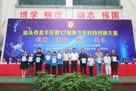 大赛以“创新、体验、快乐、成长”为主题,首先向获得全国、省、市第33届青少年科技创新大赛的老师、学生及优秀组织单位的代表颁奖(国赛获一等奖1件,省赛获一等奖1件、二等奖6件、三等奖5件,市赛获一等奖14件、二等奖58件、三等奖91件),同时向汕头市私立广厦学校、汕头市芙蓉小学、汕头市飞厦中学、汕头市杏花第二小学、汕头市外马路第三小学五所学校授予汕头市科技特色学校牌匾。