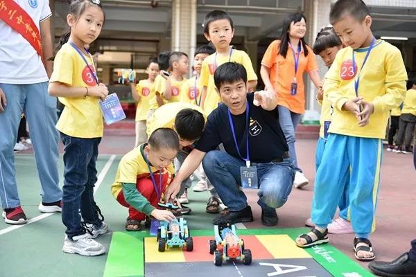 “这件作品非常有意思,解决了日常生活总是忘记浇花的问题”“这件作品创意非常好,将机器人和潮汕传统英歌文化相结合,既现代又传统。”“这套原生态蔬菜种植系统想法很好!”……众多学生、老师、爱好者和家长争相到创客作品展示区参观,对许多作品赞不绝口,并与“创造者”深入交流、互动。在运动场,进行的是儿童构建活动,孩子们在参赛区认真的组装、测试比赛器件,家长们在警戒线外张望、拍照,热闹非凡。