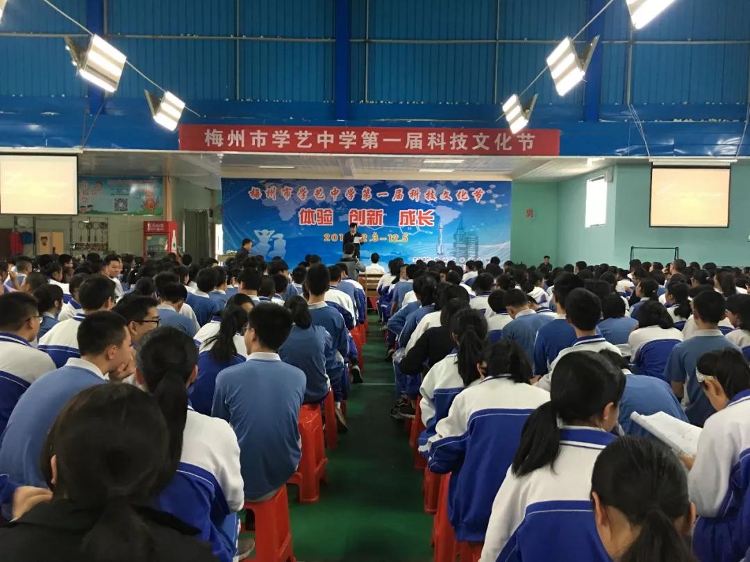2018年12月3日下午,梅州市学艺中学第一届科技文化节在体育馆拉开了帷幕。梅州市青少年科技辅导员协会、梅县区青少年创客基地参加本次科技节,为同学们带来了机器人表演和创客公开课!