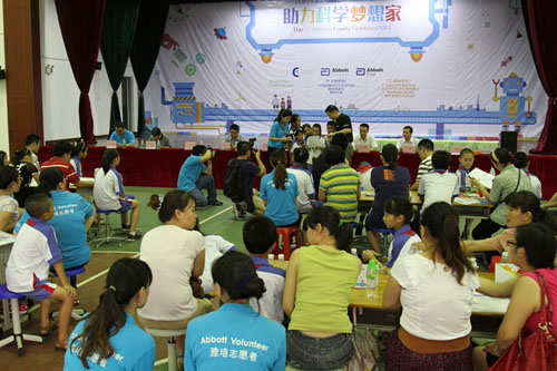 走进农民工子弟学校,放飞儿童科学梦想。5月29日,广东首场雅培家庭科学教育示范活动在广州市萝岗区永岗小学举行,省科协党组成员、副主席吴焕泉,雅培大中国区公共事务与市场支持高级总监李浩,以及省青少年科技中心、广州市和萝岗区教育局的领导和嘉宾,雅培志愿者、永岗小学师生、家长以及来自广州、东莞的观摩教师200多人参加活动。