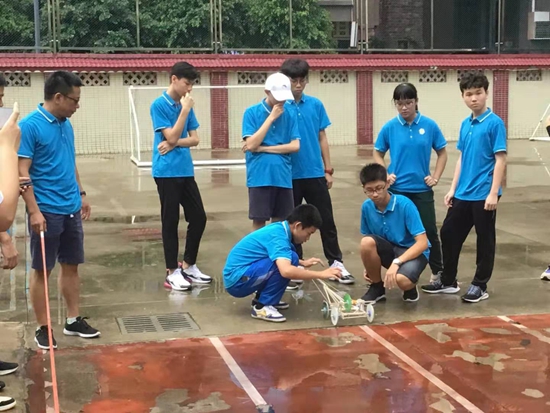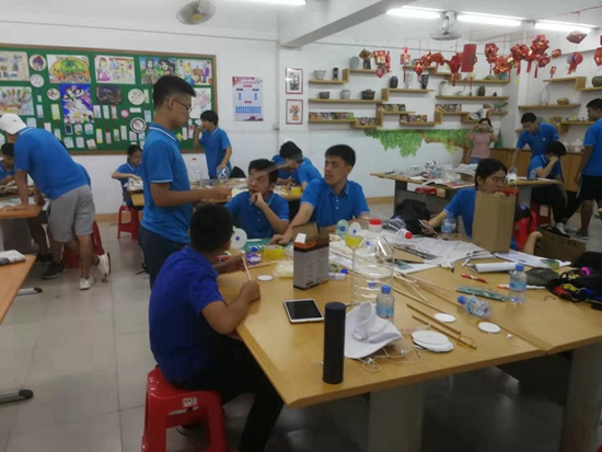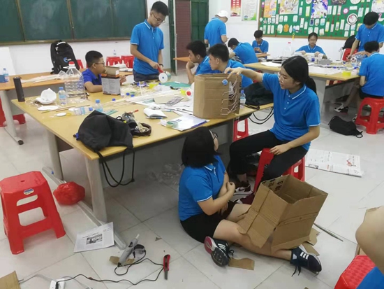 同饮珠江水,携手创玩科技。学生以小组为单位团队合作,利用简易材料现场制作了一辆橡皮筋动力小车和两套环保时装。8月23下午,在学校运动场上演的橡皮筋动力车竞赛体现了速度与激情。晚上的文艺晚会上,每组派员穿上自己制作的服装走秀并有组员进行解说,由各组派出的评委进行打分。