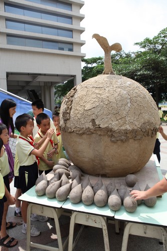 孩子们在生命的“小水滴”、“地球”上签上自己的名字