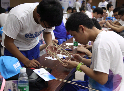 安全保护制作 在安全保护区的大学组和高中组比赛中,共有20支队伍参加比赛,分上下午两个阶段进行。上午为制作阶段,选手们得到统一发放的比赛用料后,在各自的制作台上进行结构制作。下午进行比赛,参赛队伍首先抽签决定比赛顺序,每支队伍把自己的作品调试到最佳状态。在随后10分钟比赛时间内,选手们使用赛场统一提供的砝码和测试装置,对自己作品的承载量进行测试。