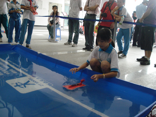 直线竞速赛分为预赛和淘汰赛。前两个项目的比赛现场气气氛比较激烈,而本项目的比赛则“风平浪静”,却又“暗流涌动”。竞速赛比的是航行距离,及相同航行距离所用时间长短,参赛选手的镇定和现场调试、放航水平非常关键。选手把调试好的赛艇放在起点,随着裁判的一声“开始”,赛艇平稳起航。有的赛艇直线起航,中途却偏移方向,影响了航程;有的赛艇载着选手的希望,直奔100分、110分、120分,引得观众和教练赞叹不已;还有的选手根据上一轮的不良情况,及时对赛艇进行调试,或是更改放航的方向,成绩明显好转……石龙中心小学的陈安琦同学,预赛时由于制作的快艇没有调试到最佳状态,放航时又比较紧张,影响了成绩,排名较后。PK赛时对手预赛的成绩远远高于她,但她及时调整了心态,从容不迫把赛艇和自己的放航调整到最佳状态。一路过关斩将,勇夺小学女子组冠军,成绩得来实在不易。本次直线竞速比赛还值得一提的是,小学男子组冠亚军之战是在石龙明德小学的两位小选手之是展开的。两位选手场外如兄弟,场内俨然一对对手,在最后的决赛中,陈路最终技高一筹夺得小学男子组冠军。