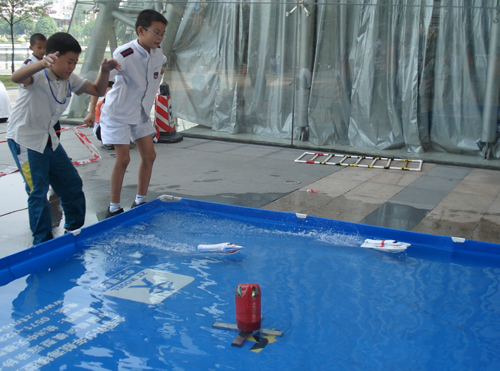 遥控电动摩托艇追逐赛在中心中厅举行,共有15所小学、7所中学的104名选手参加。