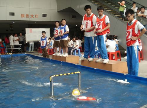 比赛一开始就进行得非常激烈。有些船速度很快,到处乱串,航线“诡异”;有些则匀速行驶,航行稳定,巧妙转弯,很少“漏标”。为了争夺航道,比赛中不时发生两船甚至多船相撞和翻船“事故”,最有趣的是有一次两船叠加,上面的船把下面的船“按”在水里,只好两船“艰难”同行。随着比赛的进行,场外观众也看出了门道,总结出经验:要想比赛成绩好,首先要保证船的航行稳定,其次才是速度。队员在赛场上的良好心态,也是取得优秀成绩的关键因素。厚街湖景中学的何锡钊选手在预赛中虽只是第五名,但他在淘汰赛中镇定自如,一路过关斩将,最后出奇制胜喜获冠军。