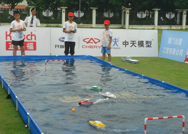 遥控摩托艇水上足球赛是本届活动中唯一的一个集体项目。比赛竞赛精彩激烈,吸引了许多人观看。小学组有30支队伍参加。经过小组赛与淘汰赛,我代表队与厦门三队挤入最后决赛。这场由长安二小李鑫怡、牛舒帆“主演”的比赛成了最惊心怵目,让人拍案叫绝的一场决赛。裁判哨声刚响,厦门三队便对我队发起“潮水”般的进攻,片刻间使我队以1:3暂时落后。一分钟过去了,两分钟过去了,……顽强、勇敢、机智的东莞赛手仍沉着应战,耐心与对手周旋,适时寻找战机!皇天不负有心人,果然,在落后2分36秒之时,李鑫怡恰到好处地把握战机!手疾眼快,加足油门……冲啊!射门!球进了!2:3。此番进攻,打乱了对手的场上比赛节奏,继而东莞队越战越勇,在7分多钟时间里连续进了11个球,以12:3拿下本届赛事小学组唯一一枚集体项目金牌!