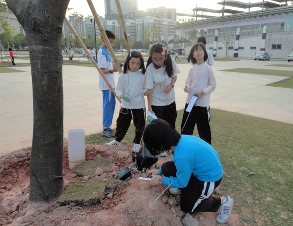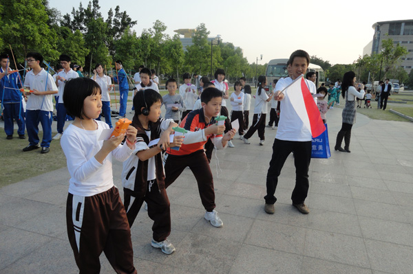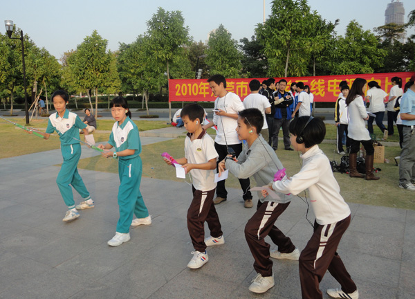 12月2日,东莞市青少年活动中心附近中心广场热闹非凡。“预备——出发!”随着裁判员一声令下,一批批选手手持无线电测向机迅速散开,寻找隐藏的电台。这是集科技、体育、趣味性于一体的2010年东莞市中小学无线电测向比赛的一个场面。134名中小学生在这里感受了“无线电”带来的不一样的乐趣。