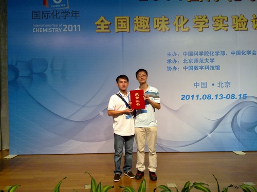 “2011国际化学年全国趣味化学实验设计大赛”是由中国科学院化学部和中国化学会联合主办、中国国家数字科技馆协办的一项重要科普活动。该活动自今年2月19日正式启动以来,得到了国内广大化学工作者和广大群众的热切关注,大赛共收到来自全国26个省市132个单位的参赛设计方案共274项。经过由来自全国各地的教授、专家和名师的通信评议和2011年8月13-14日在北京师范大学的现场实验决赛,共评出大赛一等奖10项,二等奖20项,三等奖30项。