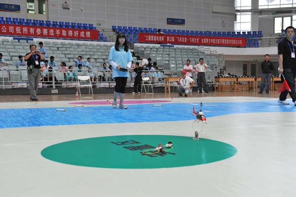 17日上午,长安第二小学杨盈盈同学夺得小学女子组遥控直升机障碍赛的冠军。在第一轮比赛时,杨盈盈的飞机突然有些失控无法向左移动,此时全场为之捏汗,然而她却处变不惊,凭着过人的技术利用反方向的办法,让飞机乖乖地听自己指挥,终于成功地完成任务。第二轮比赛,杨盈盈漂亮地完成各项任务,用时仅60.35秒,赢得了全场的喝彩。