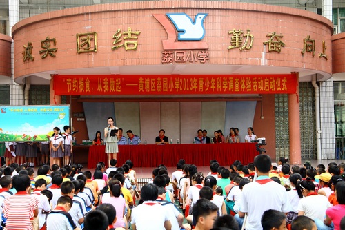 活动启动仪式 吕燕娜副校长在致辞中指出:荔园小学于2012年2月被评为广东省青少年科学教育特色学校,是全国青少年科学调查体验活动的试点校。开展青少年科学调查体验活动已有三年的时间,已取得良好的社会效果。2013年的体验活动,聚焦节约粮食,旨在让广大青少年通过对日常生活中的遇到的粮食和食品浪费问题进行科学调查、科学体验活动,帮助青少年从小科学认知粮食,自觉节约粮食,爱惜粮食,从而更加自觉地加入到珍惜粮食资源,保护生态环境的行动中来。学校将不遗余力创建活动平台,拓宽活动途径,创造活动机会,让更多的同学参与到体验活动中来,通过参观、调查、搜集资料等方式,以DV、动漫等形式记录过程,展示成果。
