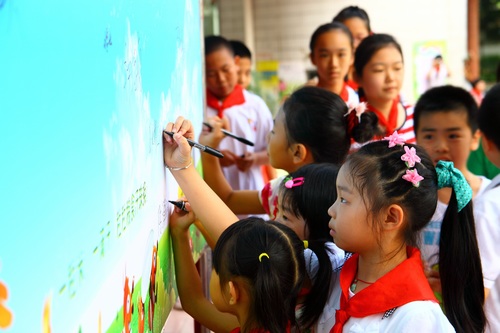 同学们争先在“我节粮我能行”签名墙上签上自己的承诺