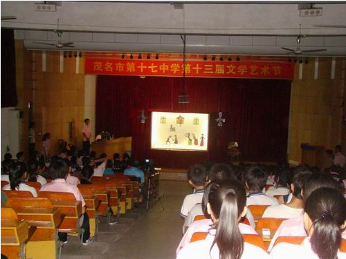 该校师生和嘉宾认真观看皮影戏表演 茂名市第十七中学非常注重传承和发展皮影戏,该校成立了皮影社团,组织学生创作并进行表演,很受学生们的欢迎。2013年,该校的《走进皮影戏》科技实践活动获得第28届广东省青少年科技创新大赛科技实践活动一等奖,并被推荐代表省参加今年8月份在南京举行的全国青少年科技创新大赛。活动当天还现场表演的《孔雀东南飞》、《灰姑娘》这两场皮影戏,是由学生们自己改编、创作、现场表演的,剧情跌宕起伏,语言诙谐生动,人物造型栩栩如生,学生们在后台齐心协力,操作道具,联袂配音演出,博得在场的嘉宾及师生们的热烈掌声。此外,在文学艺术节期间,该校还举办了美术展,展出一批优秀的学生绘画作品。