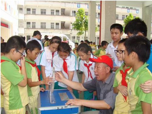 茂名石化关工委老同志与学生们一起体验科技展品 启动仪式上,茂名石化公司关工委的领导为“夕阳红”志愿者服务队及“石化少年暑期快乐营”授旗,宣布茂名石化少年暑期快乐营正式开营;茂名石化关工委“五老”讲师团的老同志为青少年学生举办了一场“中国梦—美丽中国”大讲堂活动,勉励青少年学生勤奋学习,勇攀高峰,努力争当国家、社会栋梁;茂名市科协组织科普大篷车进校园宣传,向学生展示了科普展品、展板,很受学生们的欢迎;现场还举办了“放飞中国梦”书画、剪纸、篮球比赛等活动,茂名石化关工委的老同志与学生们进行了互动,现场气氛十分热闹。