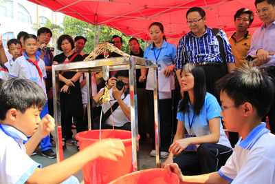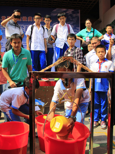 木桥梁承重赛屡破记录惊叹现场。该项赛事先由选手们用12根2.5mm×2.5mm×550mm的松木条设计制作成一座桥梁,所做桥梁的重量须小于22克。作品完成并相隔8小时后,选手将桥梁放置在测量架上,通过不断给模型添加重物施压,直到桥梁严重变形,无法继续承重。承重赛现场不断上演激动人心的一刻,小学男子组比赛中石龙中心小学邹文迪制作的18.7克的木桥梁,承重量(43.53千克)最后使得比赛用电子秤爆表(该秤设计标准为40公斤),桥模型竟未坍塌!小小木桥梁承重量超自身重量的2千多倍,惊叹全场! 接下来小学女子组比赛中该校张菁同学又以21.2克的小桥梁使电子称爆表,承重量达40.78千克!中学女子组黎泳彤同学以19.2克的小桥梁承重达40.34再次使电子秤爆表……