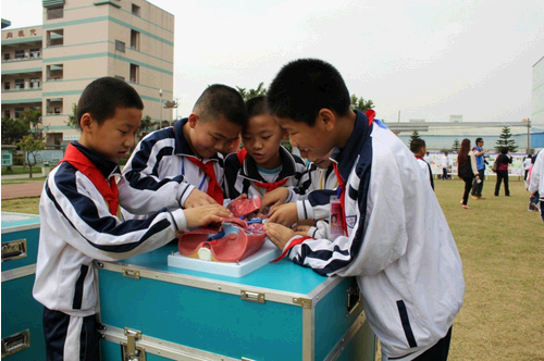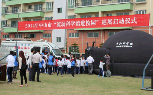 “流动科学馆进校园”巡展活动由中山市科协主办,中山科学馆承办,是一项让广大城乡青少年学生共享科普资源的常年性巡展活动,也是市科协、中山科学馆走基层、转作风而推出的“科普活动进基层”系列活动项目之一,它让科普展览搭乘“科普大篷车”直接开到校园,让广大师生在校园就可享受丰富的科普精神大餐。“流动科学馆”巡展主要内容有移动式球幕影院展演、动手动脑的“声光电”科普展品展览、科普知识展板展览、多媒体科普知识短片放映等。巡展活动由各中小学校预约,市科协根据预约安排,一般每校展出一周,整个活动暂定一年,以后将根据广大青少年学生的需求,适时推出更多、更好的展览项目。