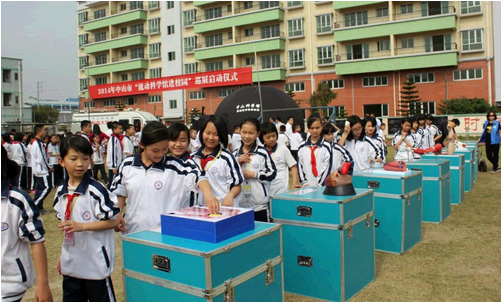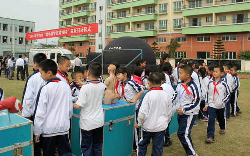 没有鲜花,没有红地毯,没有主席台,没有启动球,甚至连座位都没有,出现在眼前的只有一个直径约十米的黑呼呼的半球形大家伙(移动式球幕影院),两旁安静地停靠着一大一小两辆白色的汽车,车身上醒目地印有“科普大篷车”红色大字.....,这就是启动仪式的“主席台”。3月26日下午3点,中山市板芙镇芙蓉学校,在孩子们欢声笑语和科普志愿者忙碌的身影中,2014年中山市“流动科学馆进校园”巡展活动正式启动。