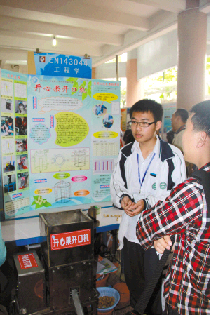 其中,佛山最早入选广东省科学教育特色学校的狮山石门高级中学,表现尤为突出,获奖数量和质量位列全市第一,共获3金3银,有两项创新成果获选参加全国大赛。高明一中学生梁铭洋发明的“开心果开口机”,不但获得大赛一等奖,还独揽海富通创新奖、卢驭龙科学实践奖、专利申请奖共三个专项奖。