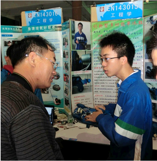 图为汕尾市参赛学生在展评现场解说其作品原理