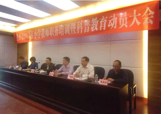 化州市2014年小学教师职务培训暨科普教育动员大会现场 这次化州市小学教师职务培训暨科普教育工作是由化州市教育局组织,由广东省科普中心与化州市教师进修学校共同承办,旨在提升该市小学教师的整体素质和执教能力,普及科学知识,从而推动化州市教育教学质量、教师结构的协调发展,也是认真贯彻党的群众路线教育实践活动的具体举措。