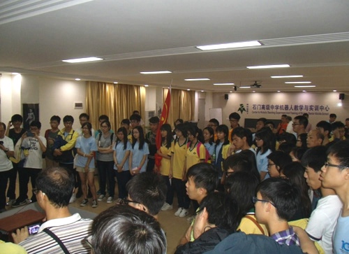 参观佛山市南海区狮山石门高级中学机器人教学与实训中心(佛山市科协 钱铖 摄) 20日下午,两地学生一起参观广东省科普教育基地——海天公司科普馆(全球最大的调味品企业,国家级工业信息化融合示范项目),一起感受海天公司信息化仓储和大规模生产的壮观场景。两地学生还参观了设在石门高级中学的“佛山市青少年科技创新实验室”、机器人教学与实践中心等,并一起参加交流晚会。交流晚会由两地学生自行编排和组织,除了街舞、吉他弹奏、COSPLAY等文艺表演外,两地学生还上台畅谈自己的创新历程与科技感想。如中国第十三届“明天小小科学家”获得者黄璜同学分享自己参加石门高级中学科学院的经历,感受科学实践需要自己坚持不懈和努力,并对科学研究产生浓厚的兴趣,同时藉此培养耐心、细心、动手能力和团队合作精神。香港的四名学生也分享自己参加科技新苗100计划的心得,如参加12场不同科技领域的培训讲座拓展了自己的创新思维,以及自己与佛山学子之间的交流感想,等等。“全国十佳优秀科技辅导员”闫灵麟老师则为学生们分享了自己与学生共同开展科技创新活动的心得,科技教师不能代替学生创造,却可以用自己的激情去影响、激发和点燃另一个年轻的富有创造潜质的生命。
