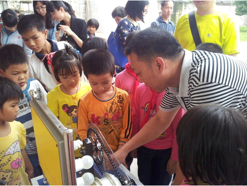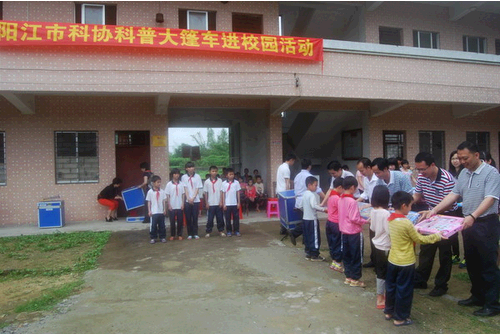 5月9日上午,雨过天晴。满载互动式科普展品的“科普大篷车”开进了扶贫村红丰镇地朗学校。这是阳江市科协联合阳江市科工信局团委开展的一次科技扶贫慰问暨科普大篷车进校园活动,主办方赠送科技书籍一批给学校,还给学习优秀的学生颁发了慰问礼物,深受地朗学校全体师生的欢迎。